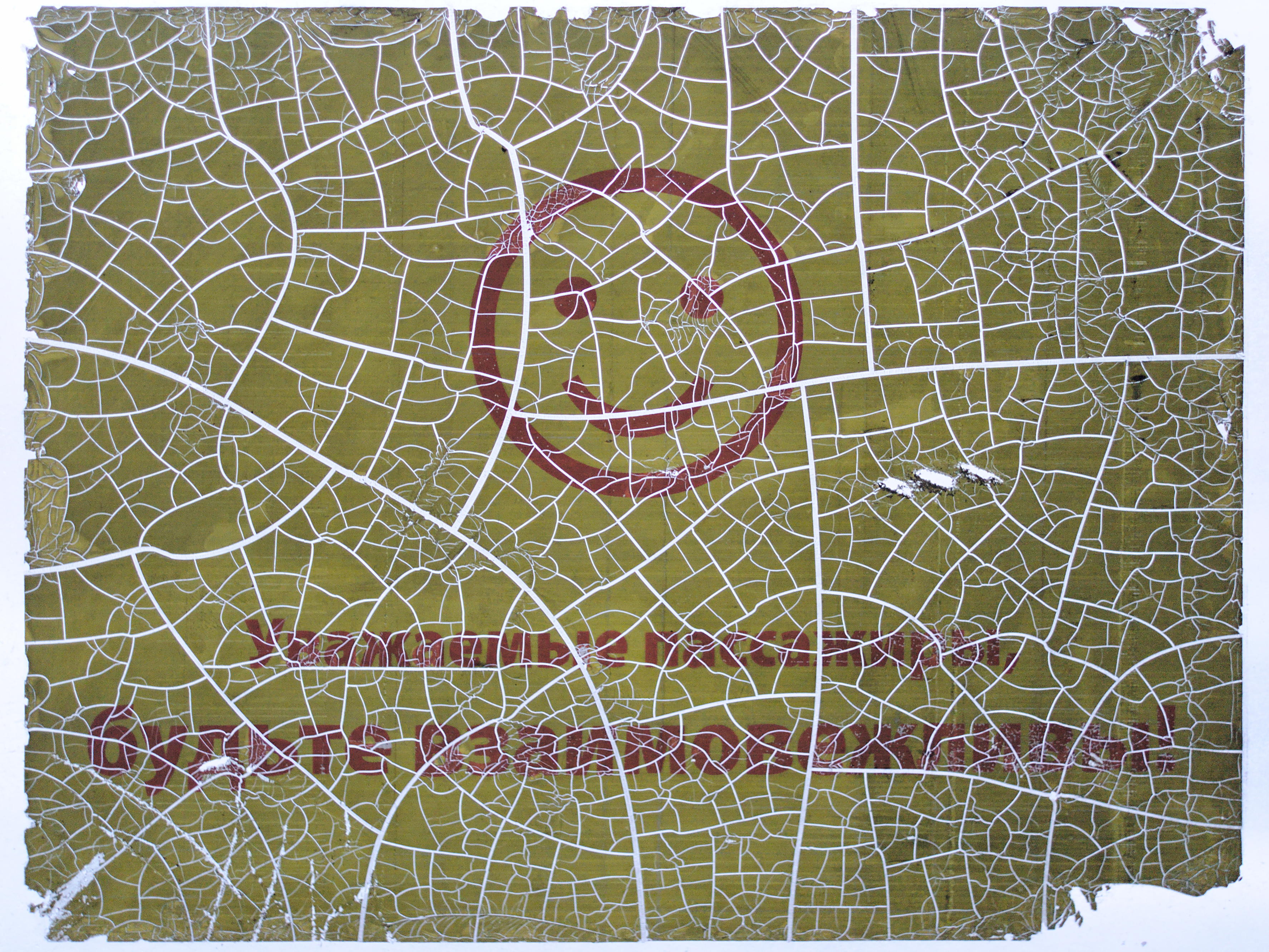 Old cracked sticker on a bus window saying "dear passengers, be polite to each other" in Russian.
