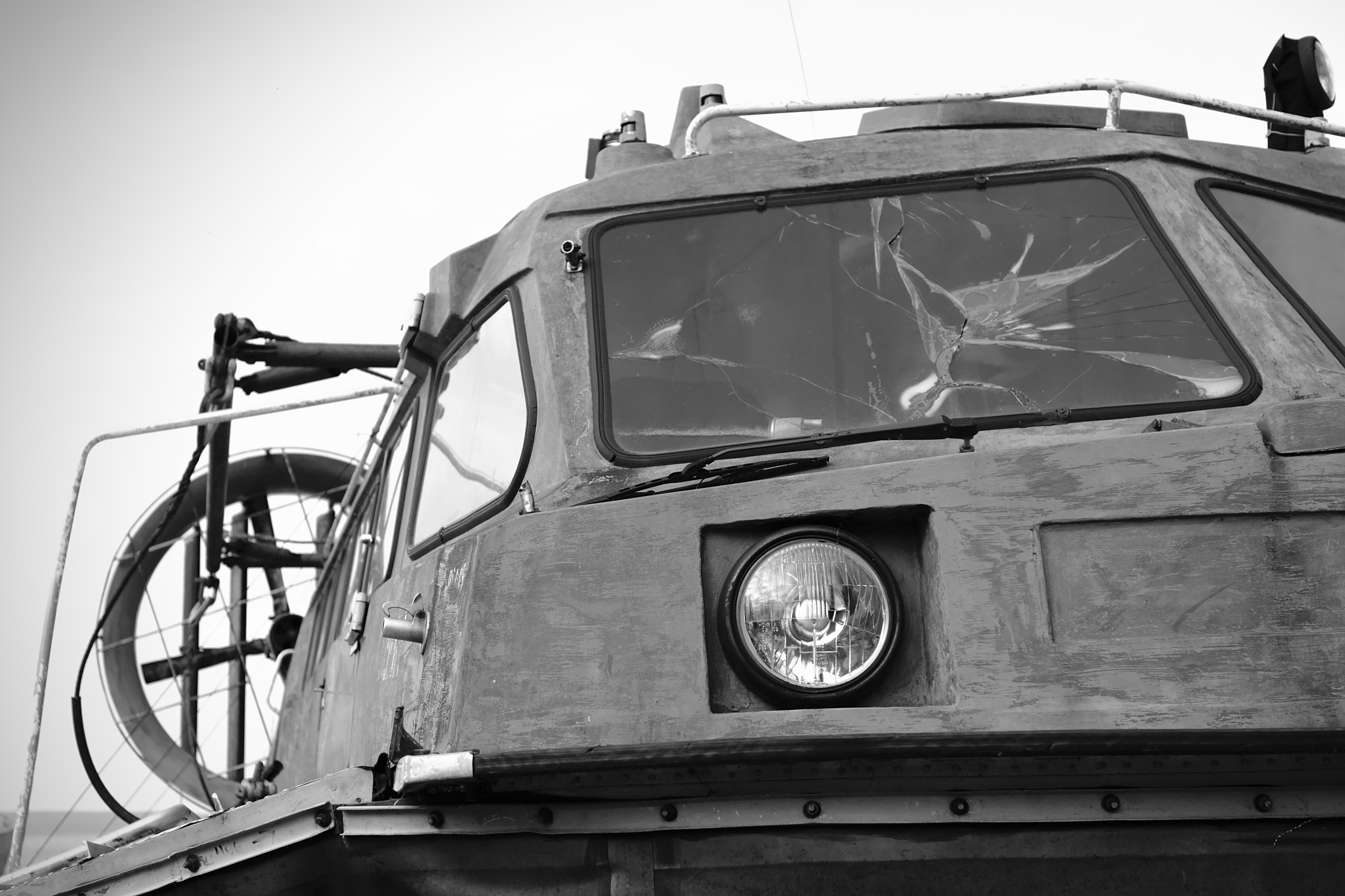 Keywords: black and white, hovercraft, watercraft, headlight, broken, windshield.