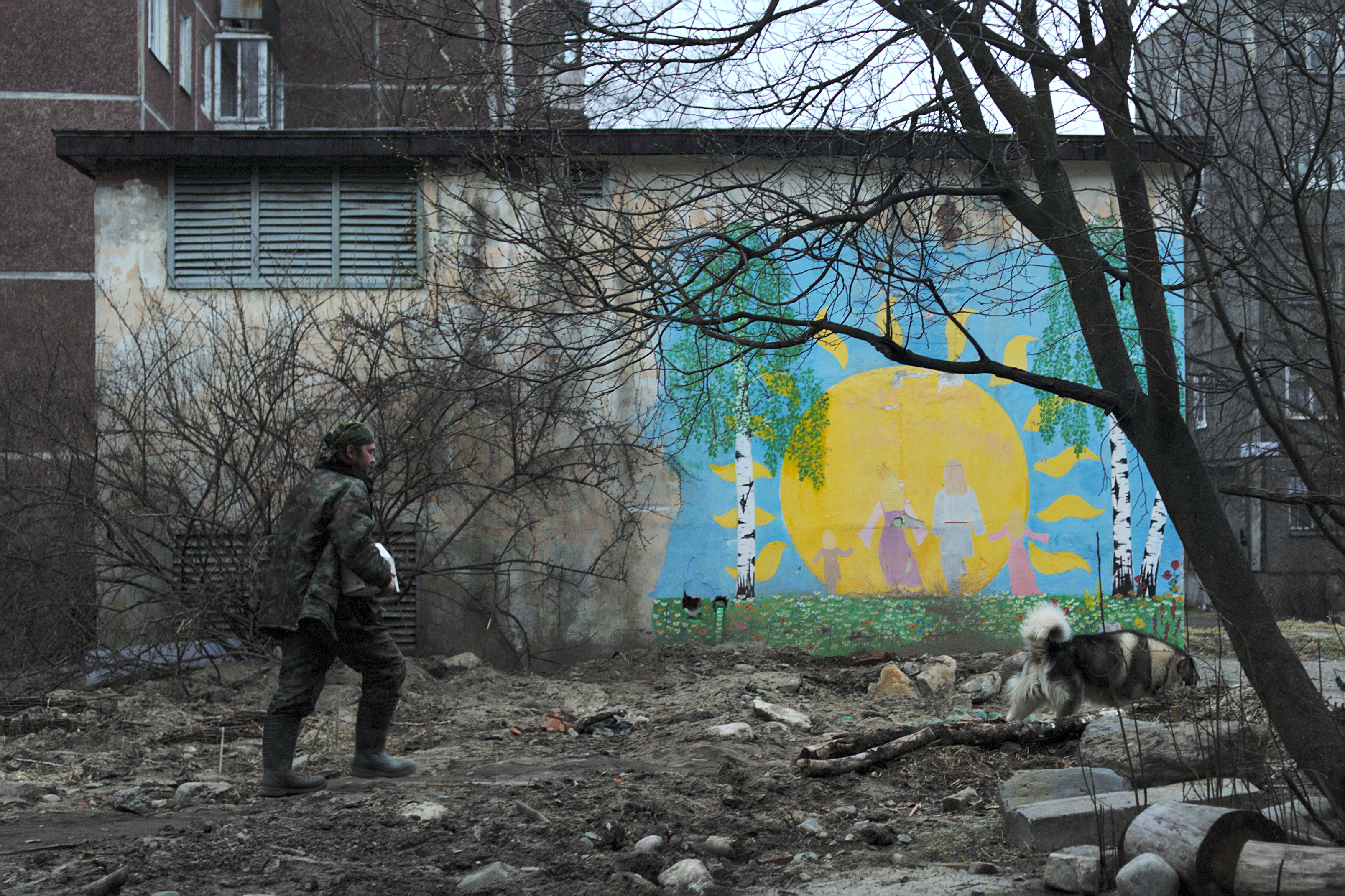 Keywords: sun, painting, man, dog, urban, Petrozavodsk, Russia.