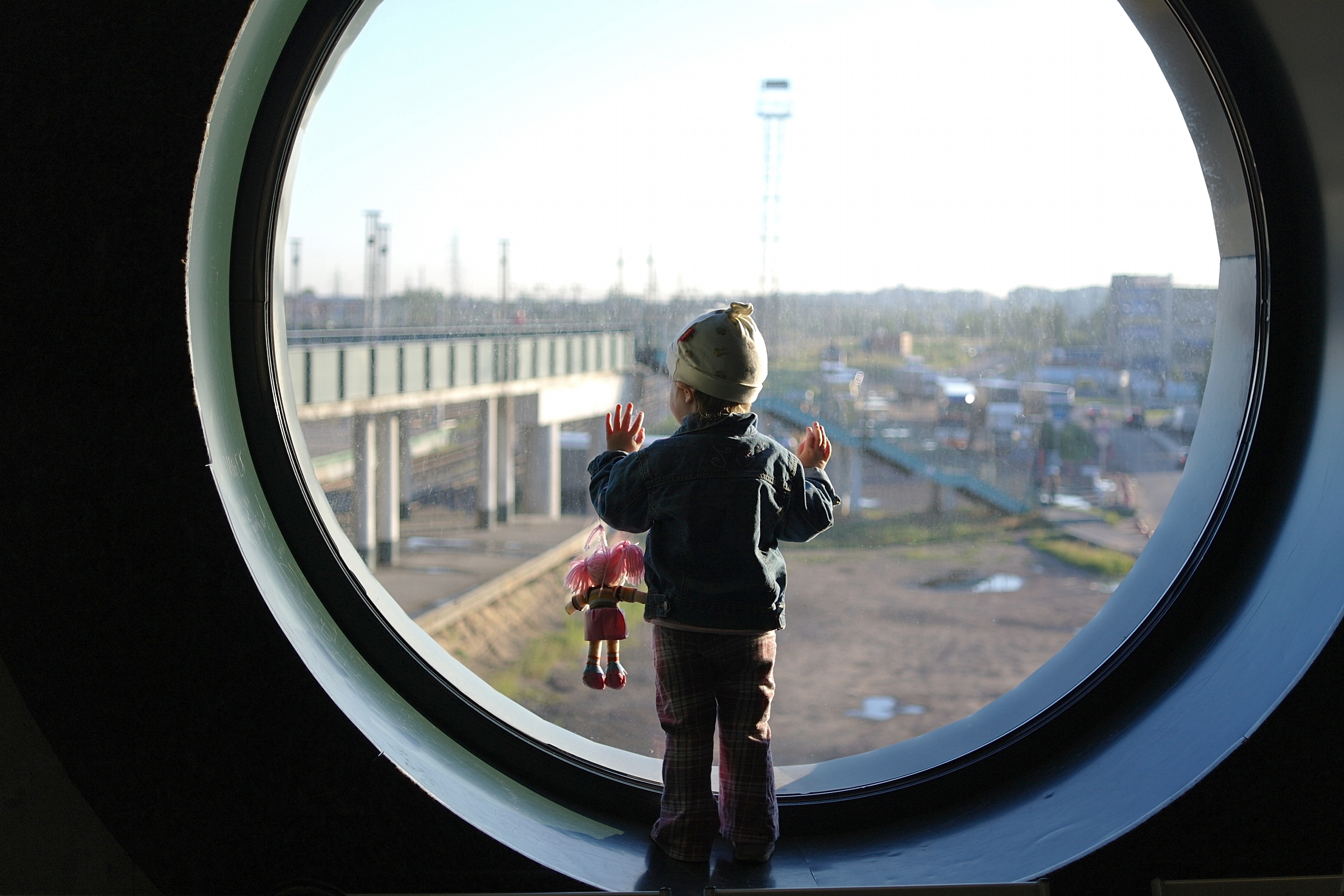 Keywords: child, window, circle, doll, urban, Saint Petersburg, Russia.